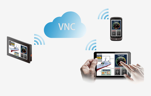 2.VNC功能。一般的設(shè)備操作,操作員只需在HMI操作界面操作就可以了。如果說HMI置放的位置不方便經(jīng)常或者長時間操作,或者操作員想隨時隨地查看和操作HMI界面,這時永宏C3/P5系列觸摸屏就能很好的幫您解決這個問題。針對操作員不在HMI操作界面現(xiàn)場的情況,操作員可以在電腦上使用VNC客戶端,或者手機上下載VNC軟件,通過網(wǎng)絡(luò),可直接將HMI的畫面顯示在電腦或者手機上,同時也能在電腦或手機上操作,支持此功能的HMI需配帶以太網(wǎng)接口。