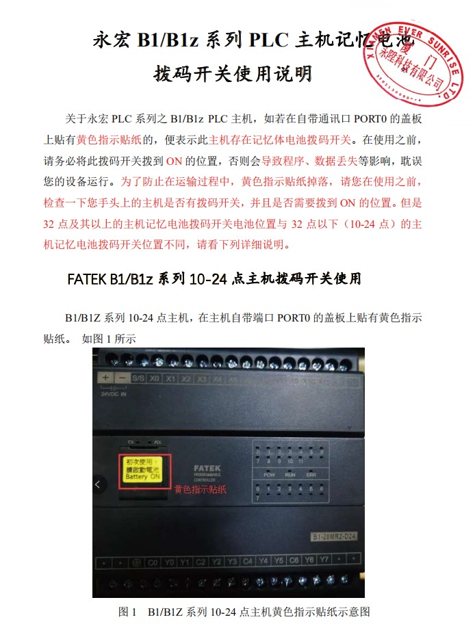 關于永宏PLC 系列之 B1/B1z PLC 主機,如若在自帶通訊口 PORT0 的蓋板上貼有黃色指示貼紙的,便表示此主機存在記憶