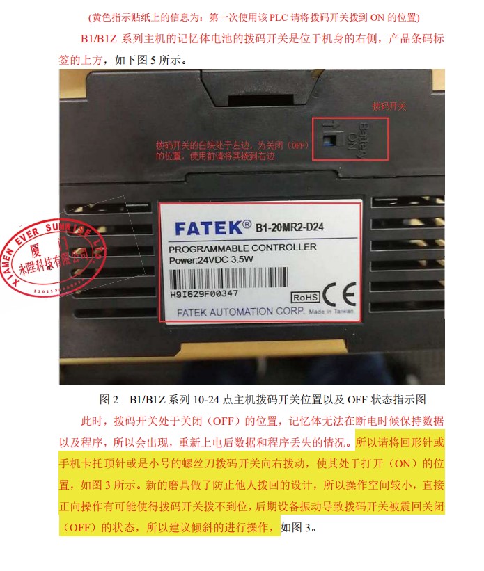 請務必將此撥碼開關撥到 ON 的位置,否則會導致程序、數據丟失等影響,耽誤您的設備運行。為了防止在運輸過程中,黃